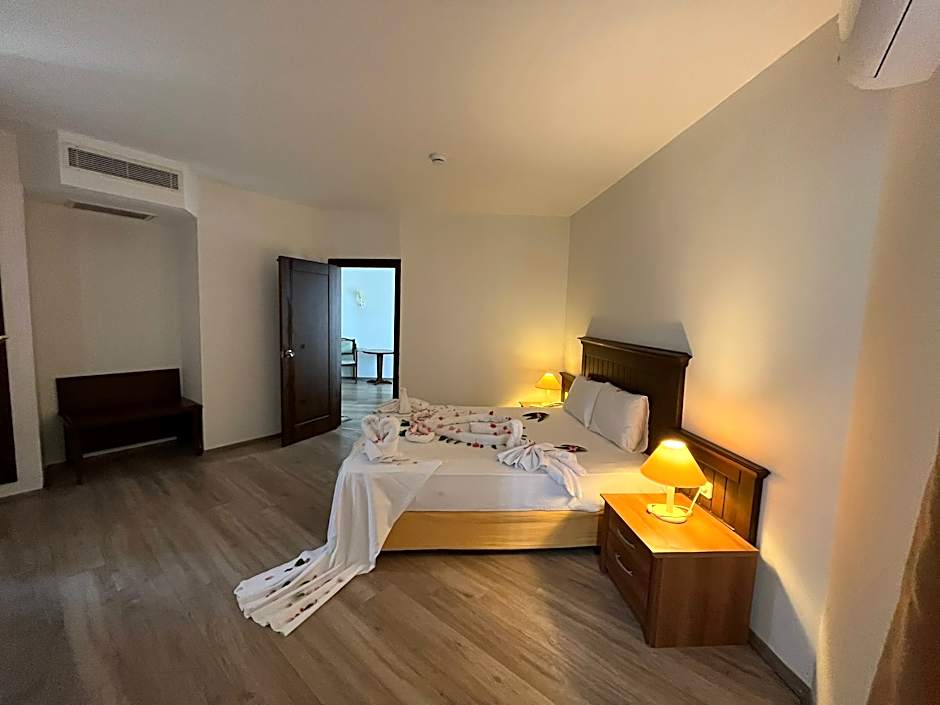 This family room features a hot tub. The spacious air-conditioned family room provides a flat-screen TV with satellite channels, soundproof walls, a mini-bar, a seating area as well as sea views. The unit offers 3 beds.